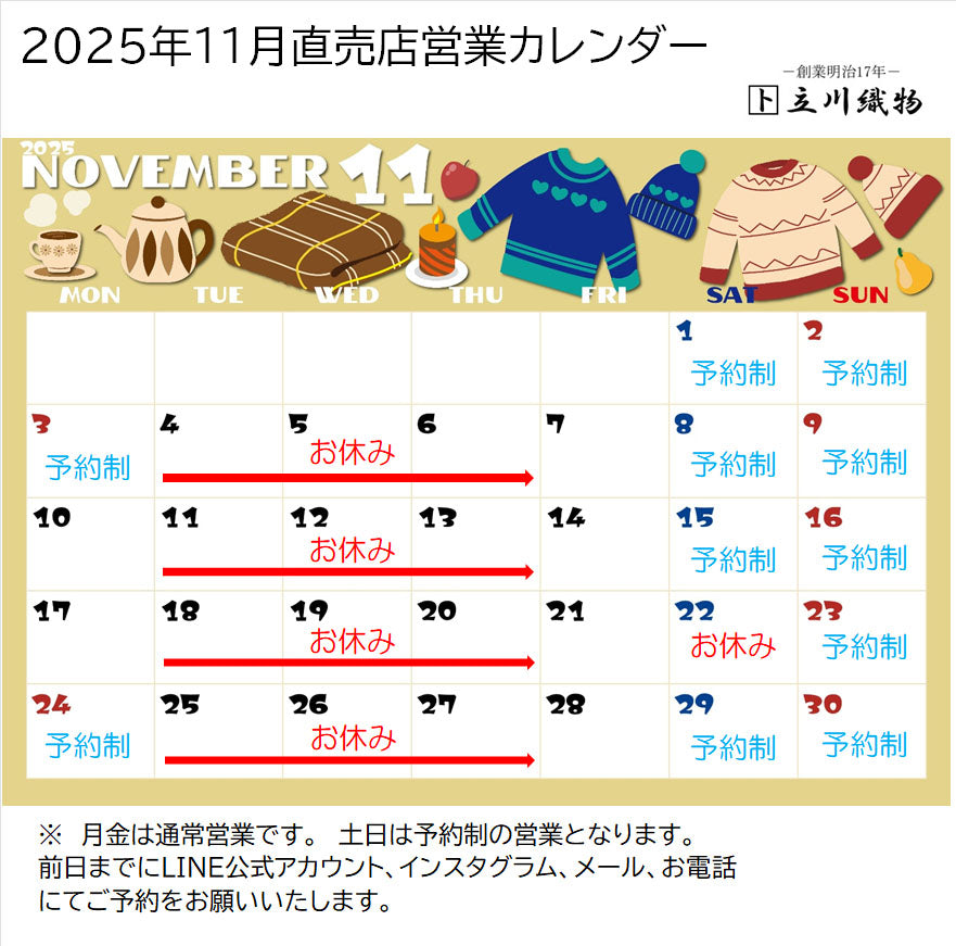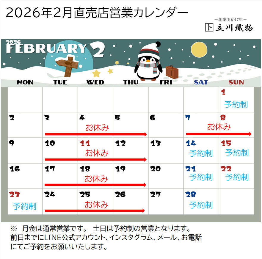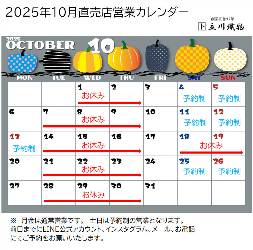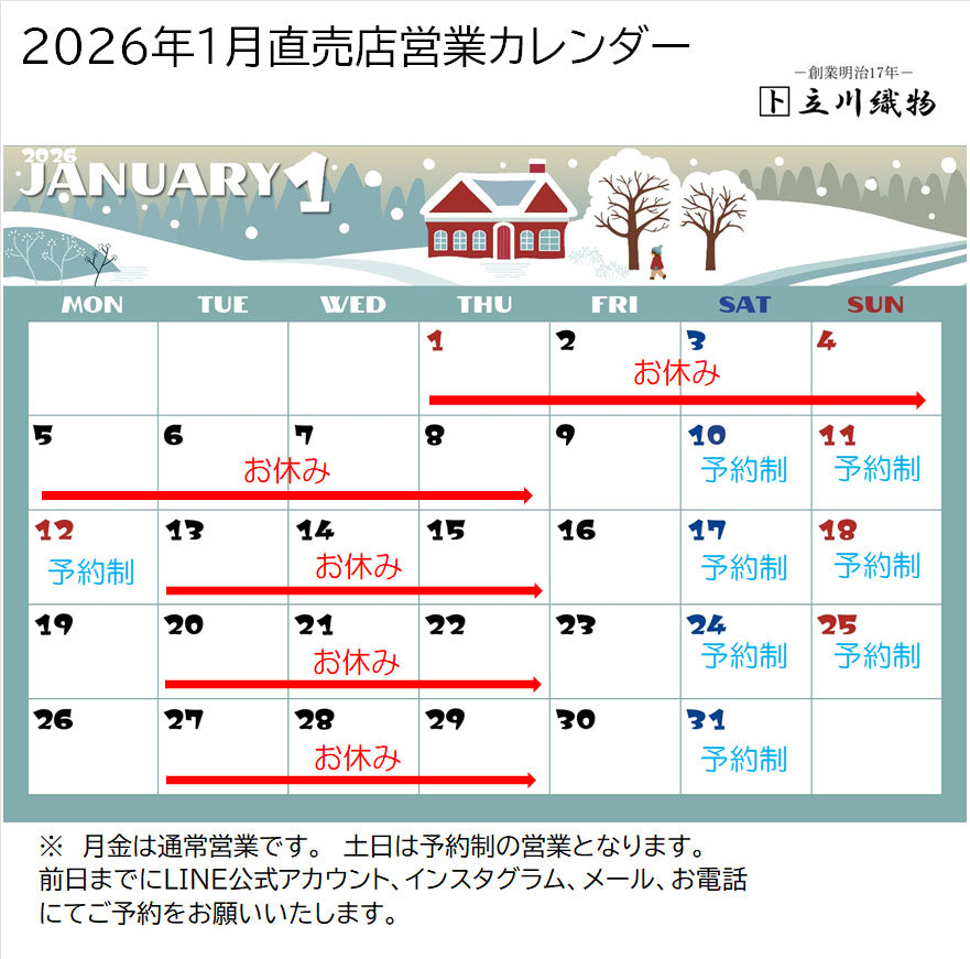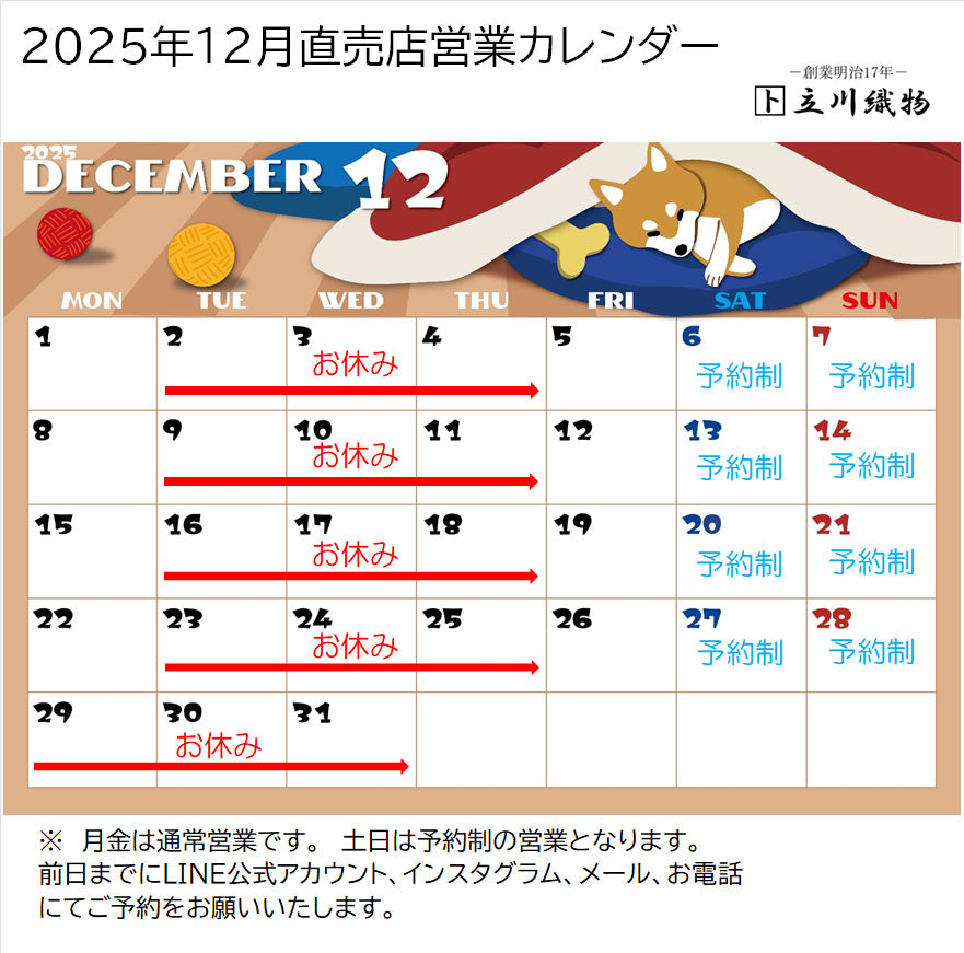 亀田縞 立川織物直売店は毎週 金土日月を営業日といたします。